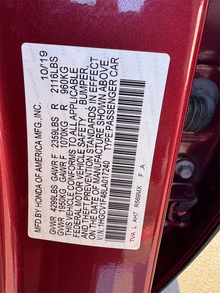 2020 Radiant Red Metallic Honda Accord 1.5T I4 DOHC 16V Turbocharged VTEC FWD EX