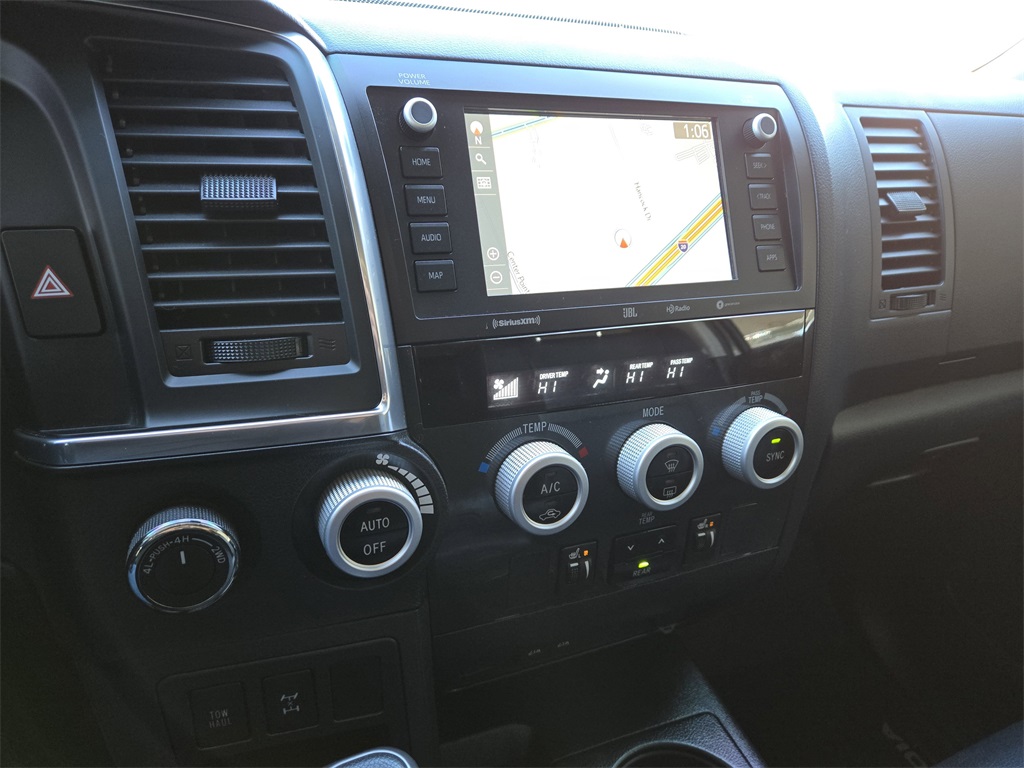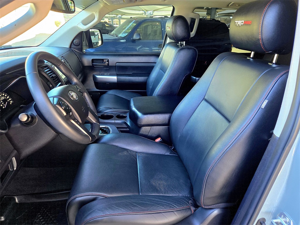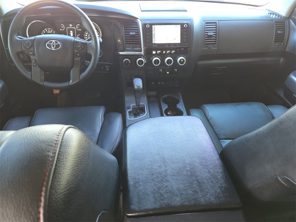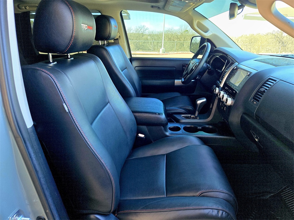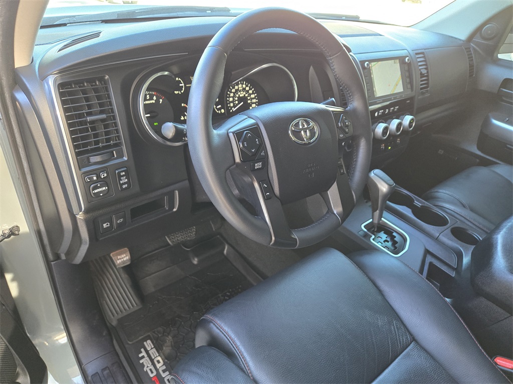 Clean CARFAX. 4WD, Bluetooth, Hands-Free Connections, Navigation / GPS / Telematics, Portable Audio Connections, Premium Audio, 3rd Row Seats, Backup Camera, Heated and Cooled Seats, Leather Seats, Premium Wheels, High Performance Tires, Sunroof / Moonroof, Power Liftgate, Towing Package, Sequoia TRD Pro, 4D Sport Utility, 5.7L V8, 6-Speed Automatic, 4WD, Black w/Leather Seat Trim, Auto-Dimming Rear-View Mirror, Compass, Door Scuff Plate, HomeLink Universal Transceiver, Navigation system: Dynamic Navigation (3-year trial), TRD Pro Package.