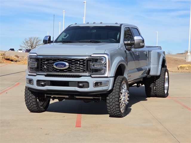 2024 Ford F-450SD Limited DRW 4D Crew Cab Limited Glacier Gray Metallic TriCoat 6.7L High Output Power Stroke V8 Diesel 10-Speed Automatic 4WD This vehicle comes well equipped with FX4 Off-Road Package (Hill Descent Control, Off-Road Specifically Tuned Shock Absorbers, and Unique FX4 Off-Road Box Decal), GVWR: 14,000 lb Payload Package, Snow Plow Prep Package (Rapid-Heat Supplemental Cab Heater), F-450SD Limited DRW, 4D Crew Cab, 6.7L High Output Power Stroke V8 Diesel, 10-Speed Automatic, 4WD, Glacier Gray Metallic TriCoat, Admiral Blue/Light Slate Leather, and Navigation system: Connected Navigation (includes complimentary 1-year trial)